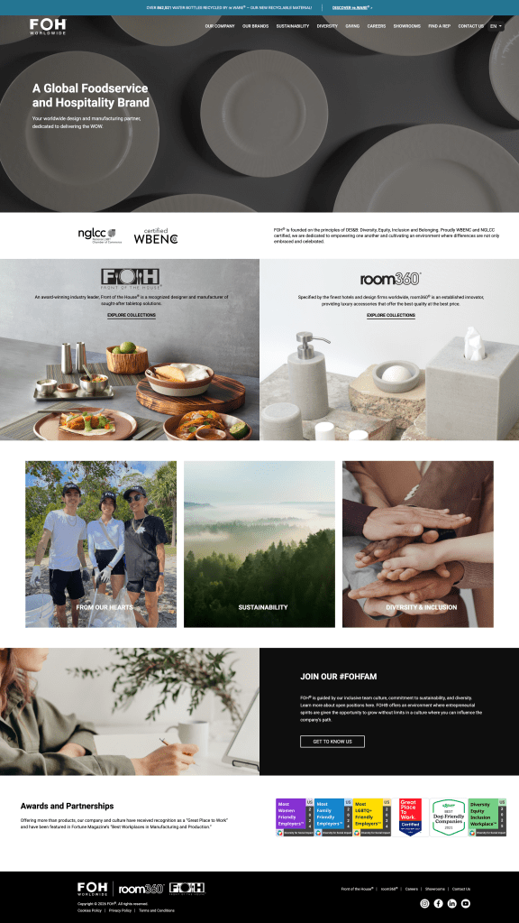 Since joining FOH back in 2021, I have had the opportunity to redesign and update our various websites several times, but creating the company’s corporate website posed a new exciting challenge; Unlike working from existing sites, this one would be brand new and I’d have much more creative freedom with the design. Our goal this year was to merge our two subdivisions into one brand, FOH Worldwide. We wanted this new website to be an introduction to the brand that was more informational than sales-focused. During each phase, I collaborated and worked closely with the marketing and IT departments, creating designs that were both interactive and feasible for our web developers to launch in a timely manner.